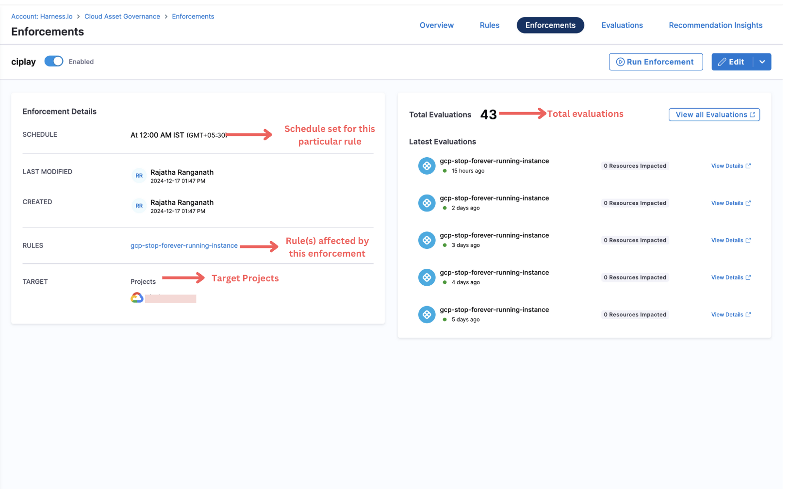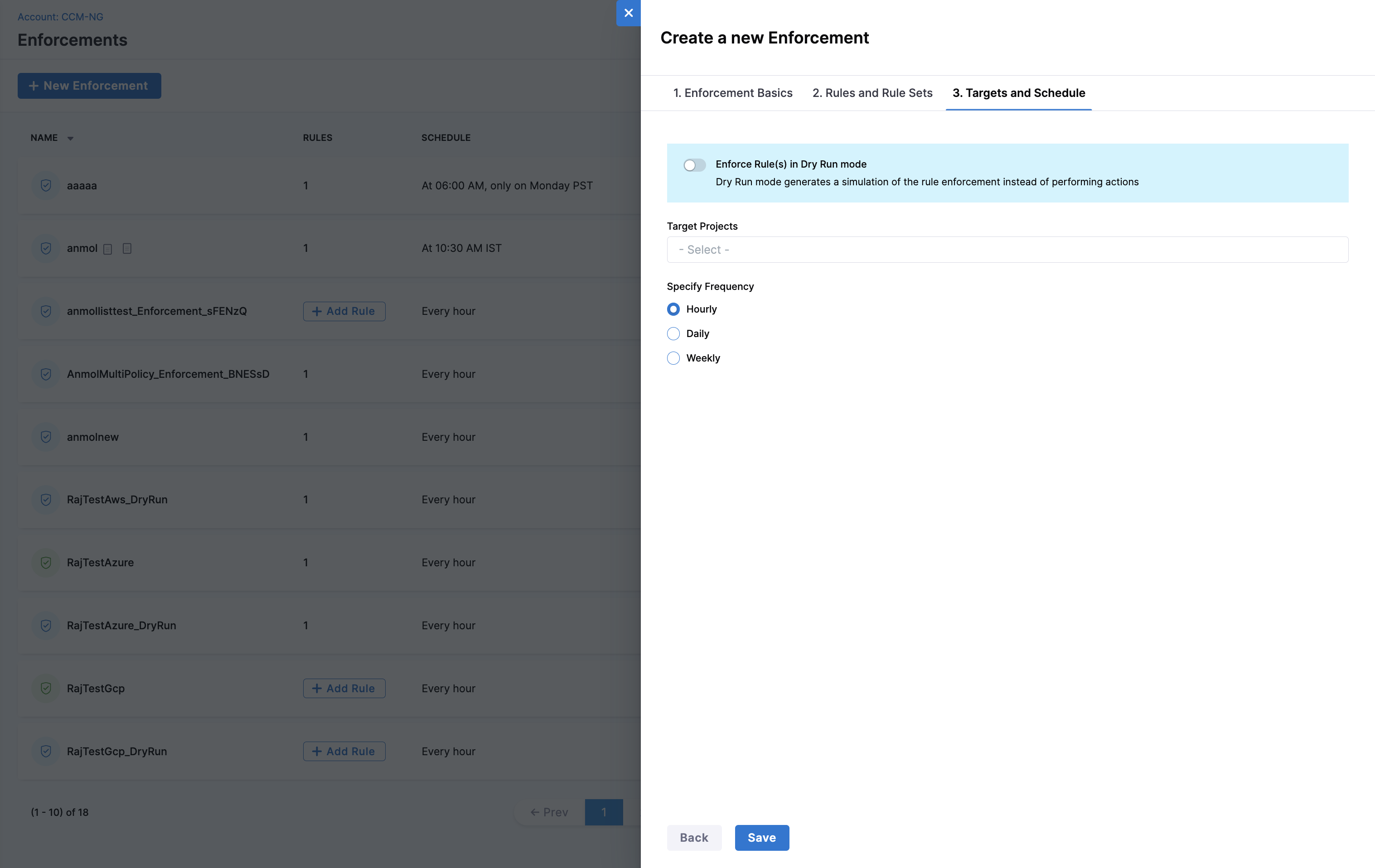 Enforcements enable you to enforce a certain set of Rules or Rule Sets (also known as governance guardrails) against a specific set of targets (accounts, projects, or subscriptions) to run periodically. Sometimes, we need rules to run periodically, such as every day, week, or month. However, running these rules manually every day or week at a specified time creates extra overhead and is a slow process prone to manual errors. To solve this, you can use Enforcements that allow you to set up a timely schedule and choose the day, time, and frequency for their rules or rule sets.