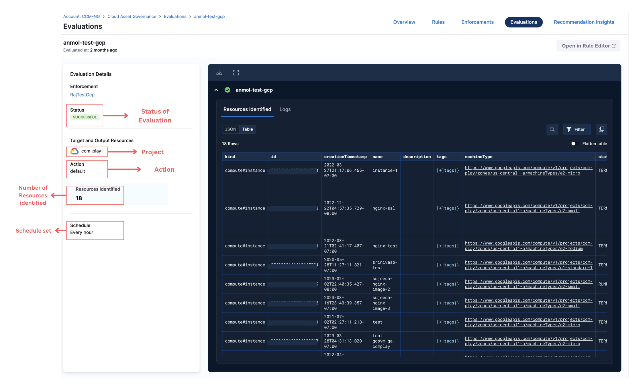 5. Select the rule for which you want to view the Evaluation details. The target project, identified resources and evaluation logs are displayed.