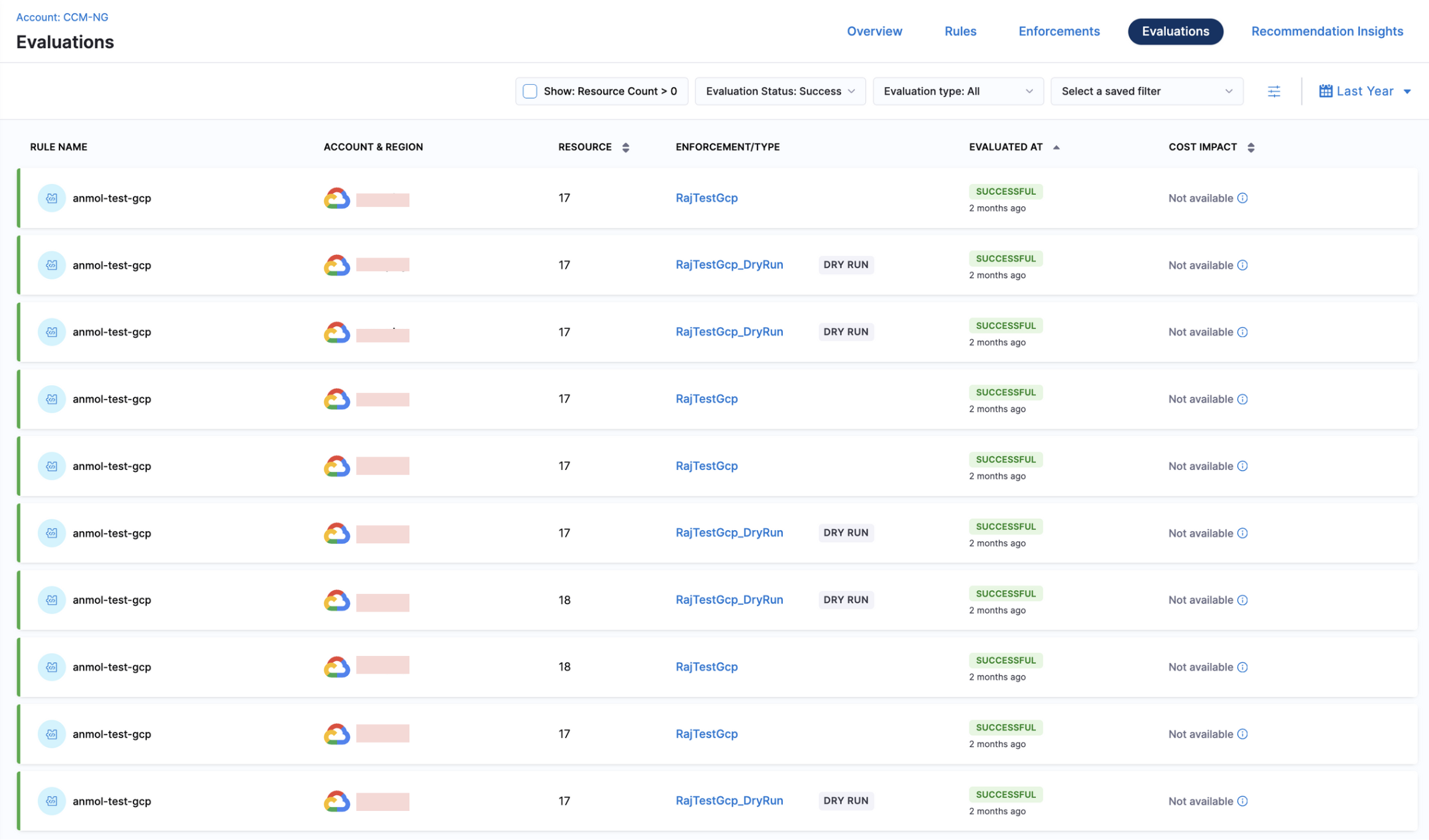 Evaluations include all the data about enforcements run (both RUN ONCE from rule editor and from Enforcement). The Evaluations window also shows you the total cost impact with each Enforcement i.e. the costs or spendings associated with each Evaluation along with the last time that Rule/Rule set was enforced. With Evaluations, you can view and audit all the Enforcements that ran in the past.