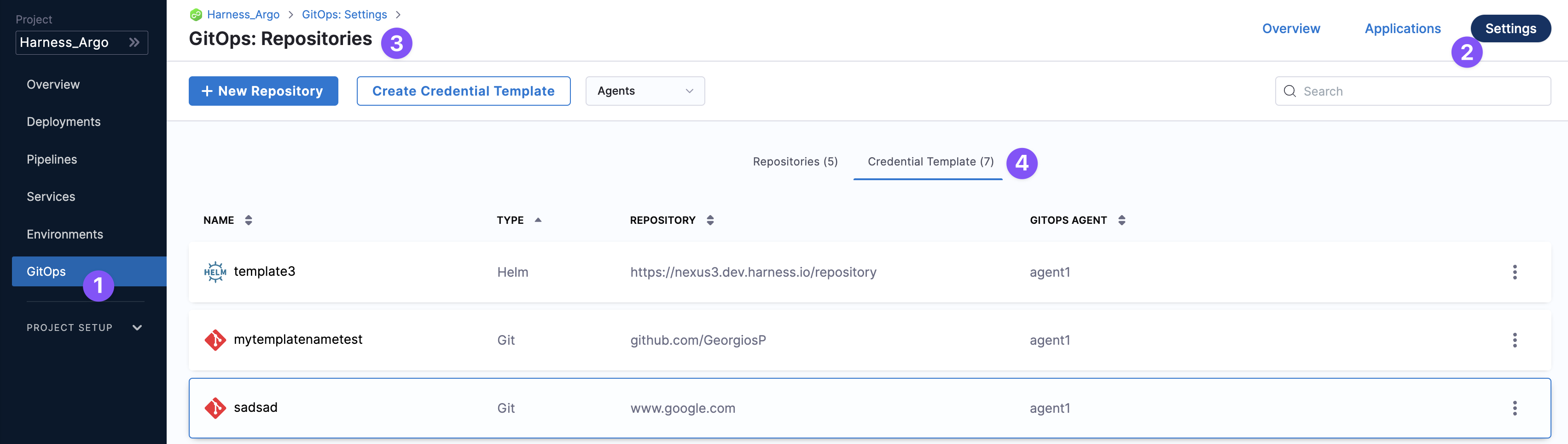 - Click Finish. You now have a Harness GitOps Repository Credentials Template added.