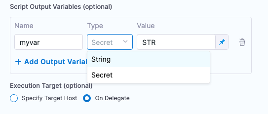 When executing a script, you can also dynamically capture the execution output from the script, providing runtime variables based on the script execution context, and export those to another step in the same stage or another stage in the same pipeline.