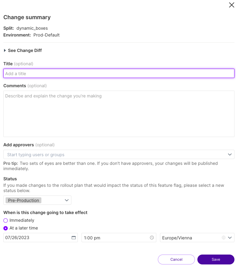 1. After you make changes to a feature flag, the When is this change going into effect option in the Change summary page appears: