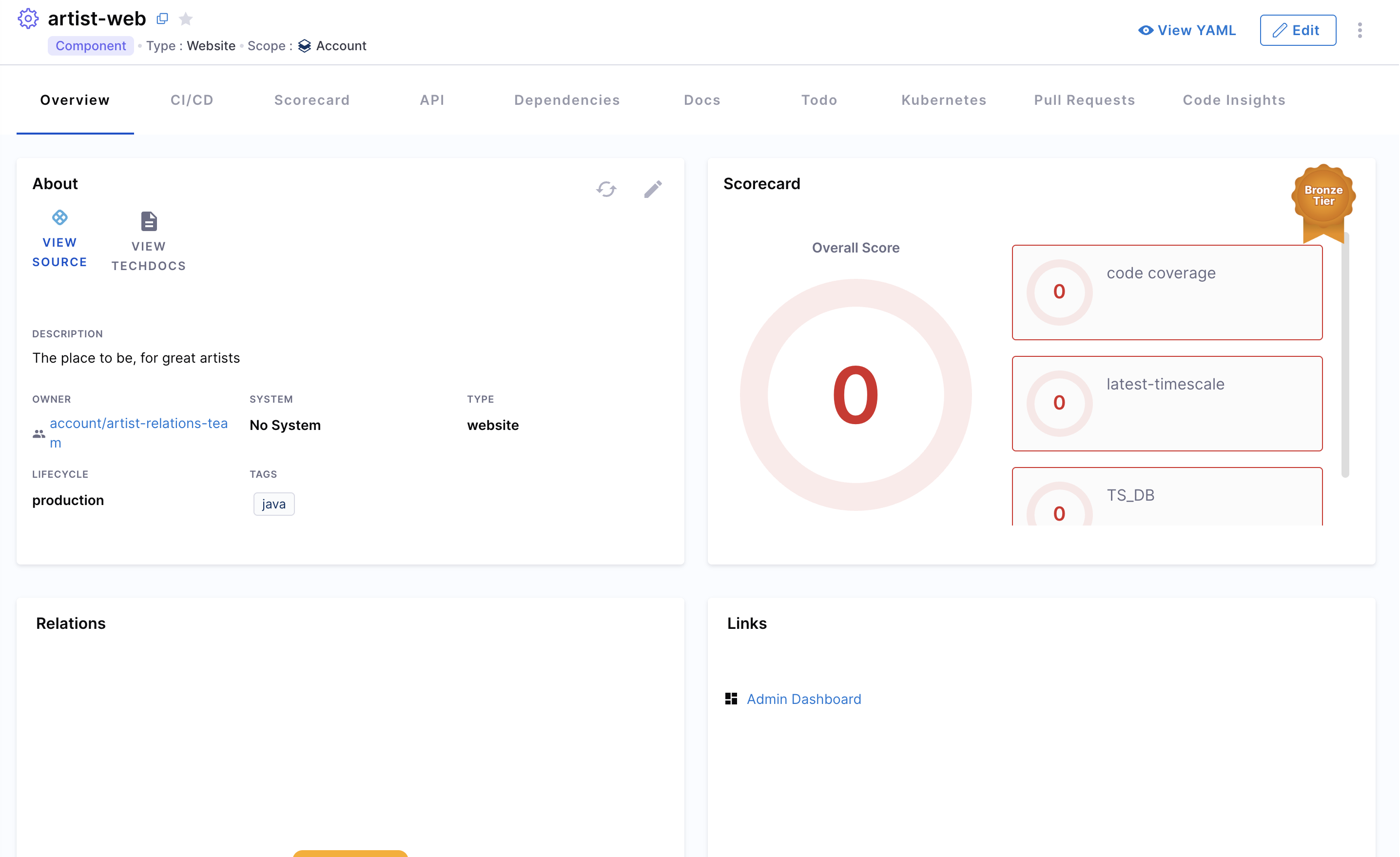 The Catalog Entity Details Page is divided into multiple tabs, each showing different components, cards, and views relevant to that entity.