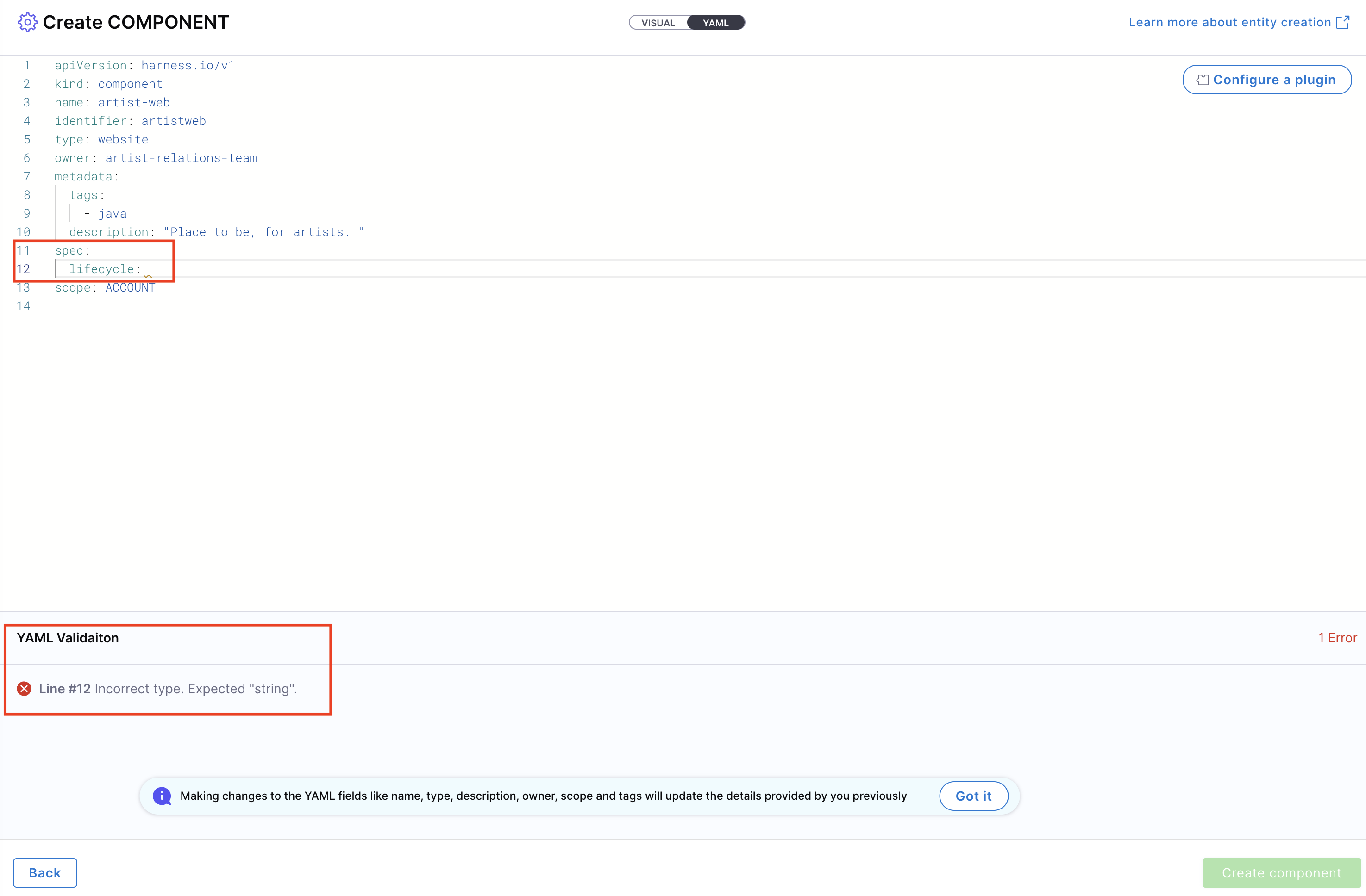 - If you’re using a legacy Backstage YAML, paste it into the YAML view. Harness will convert it into the Harness-native format automatically. You can then proceed to finalize and create the entity. Since the Visual and YAML views are live-synced, changes made in one view will reflect in the other.