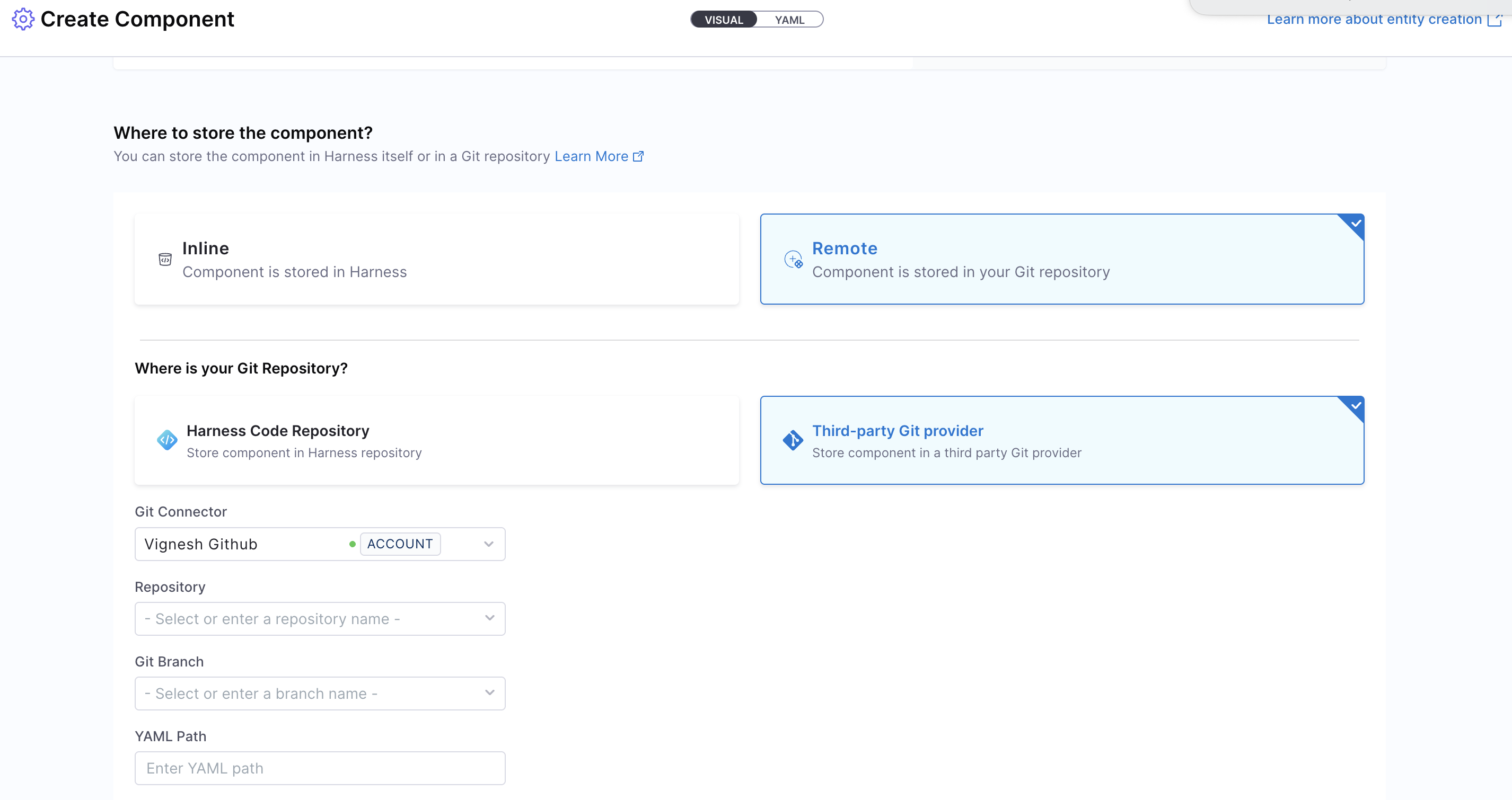- If you’re using a legacy Backstage YAML, paste it into the YAML view. Harness will convert it into the Harness-native format automatically. You can then proceed to finalize and create the entity. Since the Visual and YAML views are live-synced, changes made in one view will reflect in the other.