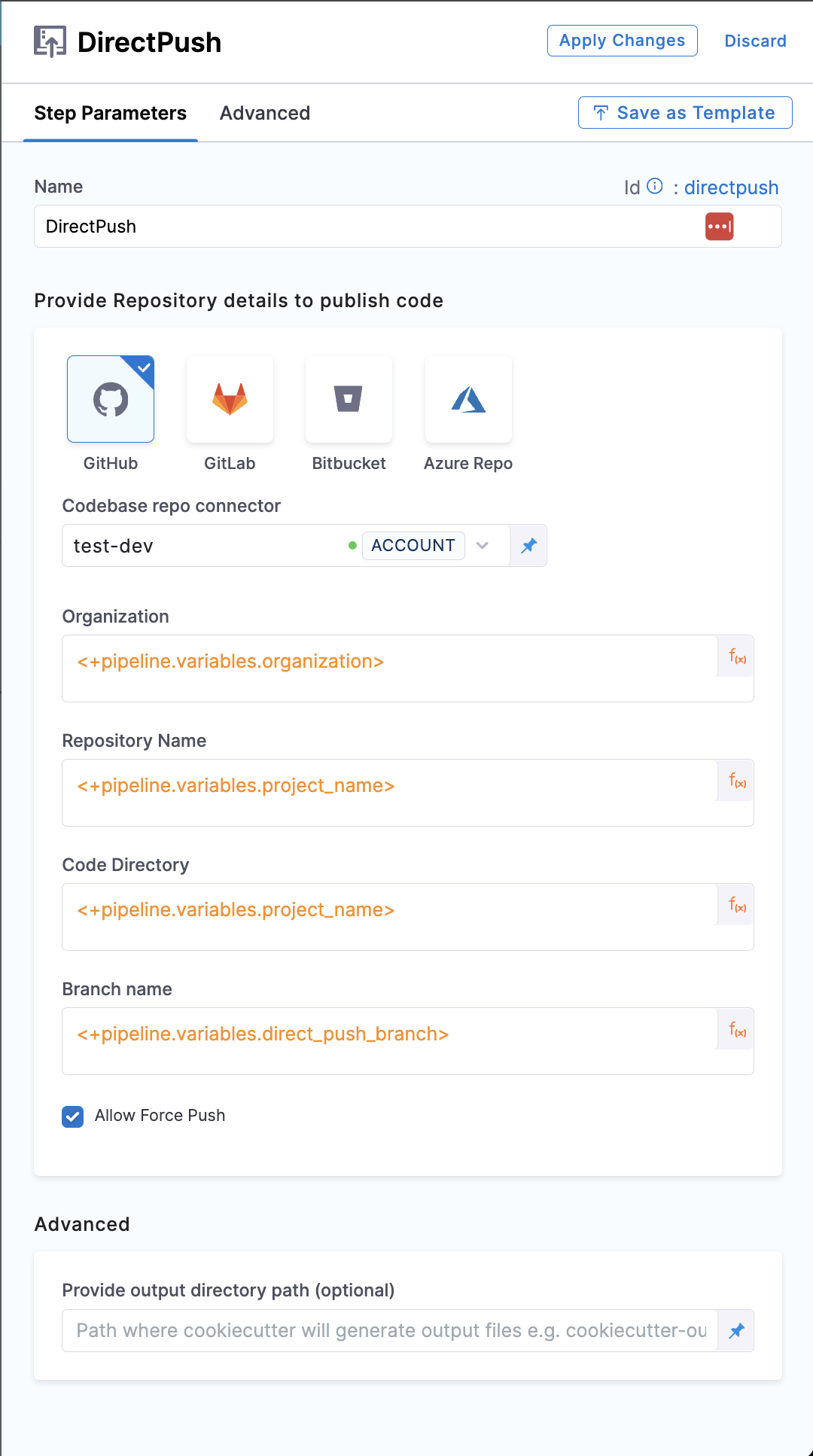 workflow.yaml, under thestepsproperty field, setshowOutputVariablestotrue. - Define pipeline output variables under the