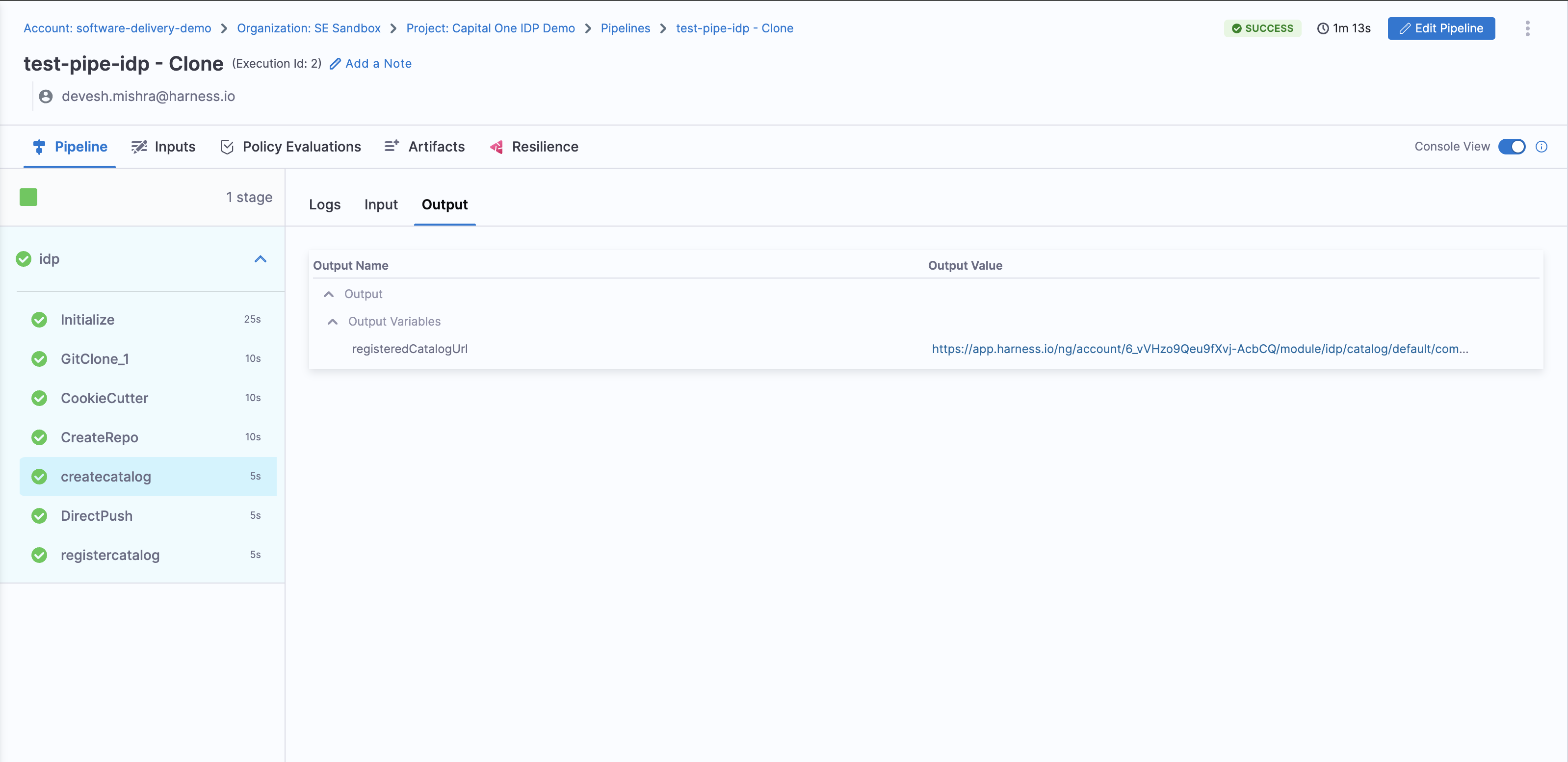 cookieCutter: Used to take inputs for the cookiecutter template.createRepo: Used to create the repository in your git providerdirectPush: Used to push the service/application created using Cookiecutter step along with the catalog-info.yaml in the repo you created in previous step.registerCatalog: Used to register the software component created in the Harness IDP Catalog.slackNotify: Used to notify individual developers once the pipeline is executed successfully and your Software component is registered successfully in your Software Catalog.createResource: Used to create Harness entities like projects, users, connectors, pipelines, secrets, etc.updateCatalogProperty: Used to update the catalog metadata for your entitiescreateOrganisationcreateProjectcreateCatalog