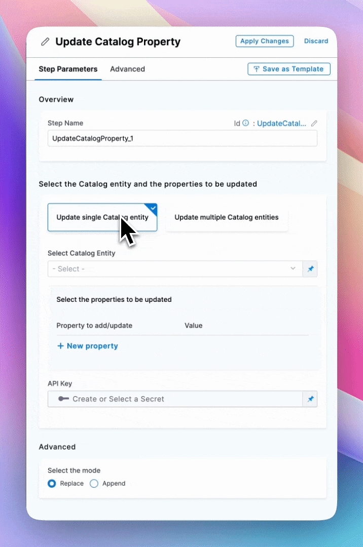 The API Key field is optional. If left empty, the credentials of the user executing the pipeline will be used to update the catalog entity.