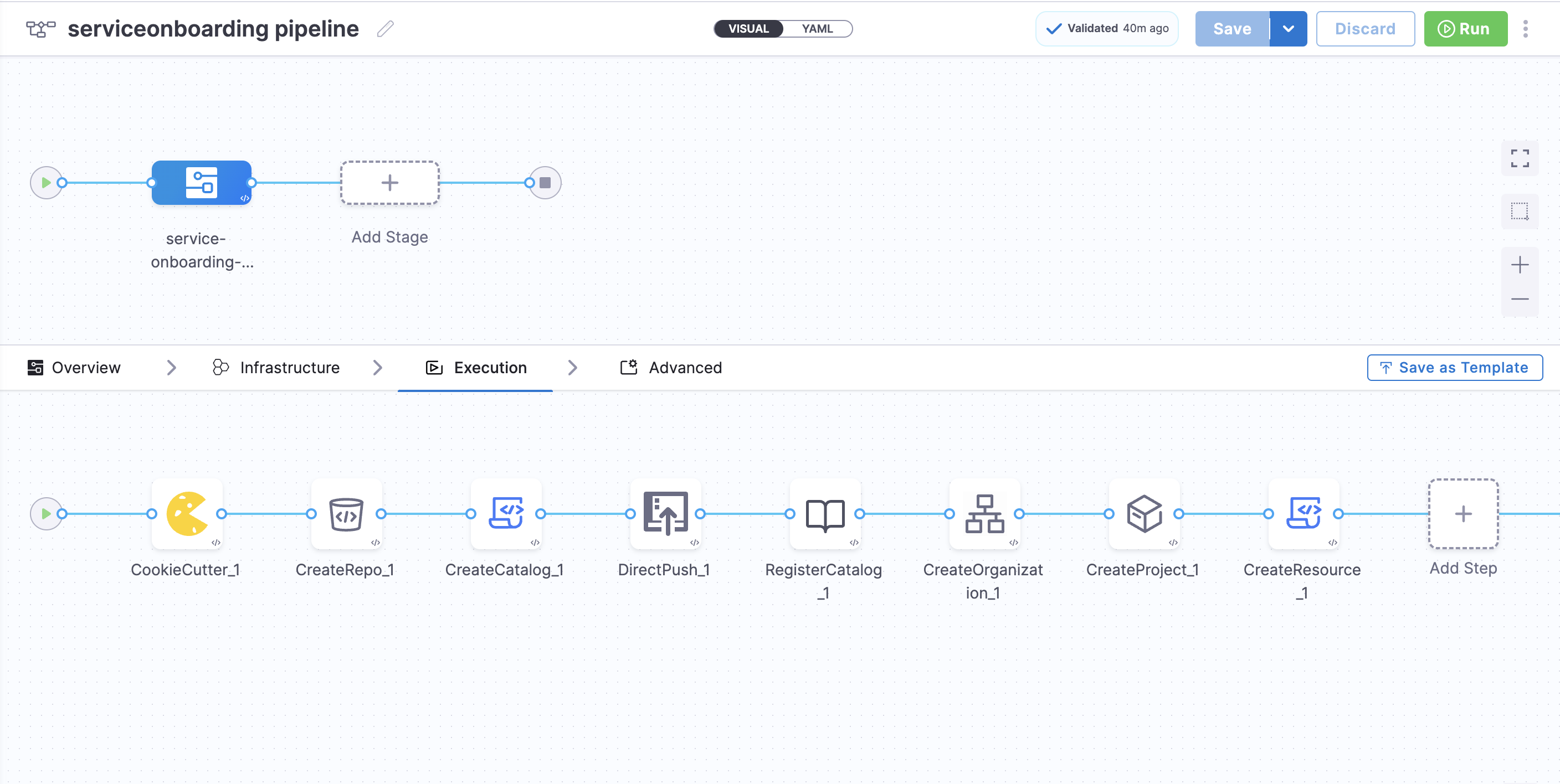This tutorial is designed to help a platform engineer to get started with Harness IDP. We will create a basic service onboarding pipeline that uses a Workflow and provisions an application templated by cookiecutter for a developer. After you create the software template, developers can choose the Workflow on the Workflows Overview page and enter details such as a name for the application and the path to their Git repository. The service onboarding pipeline creates a new repository and adds a catalog-info.yaml to it and registers it back into your software catalog all using the new Developer Portal stage.