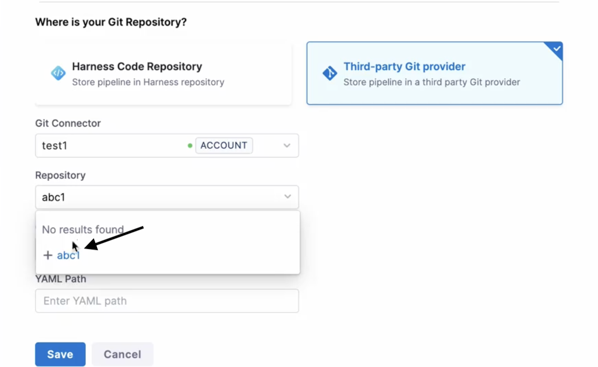 • Add a remote pipeline in Harness, and it gets added to your specified Git repo and branch.