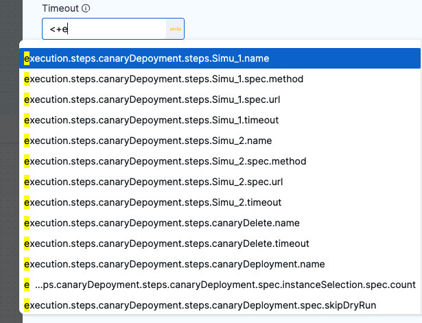 When you type <+, Harness provides suggestions for built-in expressions as you type. You can manually trigger the suggestions by placing your cursor after <+ and pressing ctrl + space.