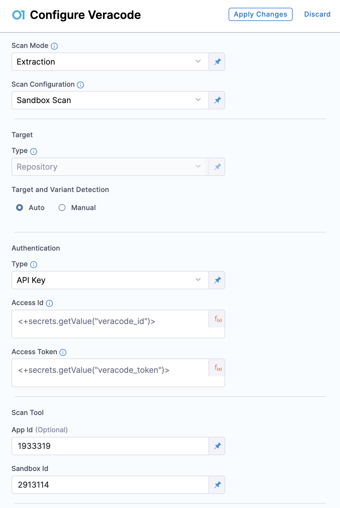 The Veracode step in STO supports three scan modes, Orchestration, Ingestion, and Extraction. Refer to the documentation specific to each mode for details and configuration instructions.