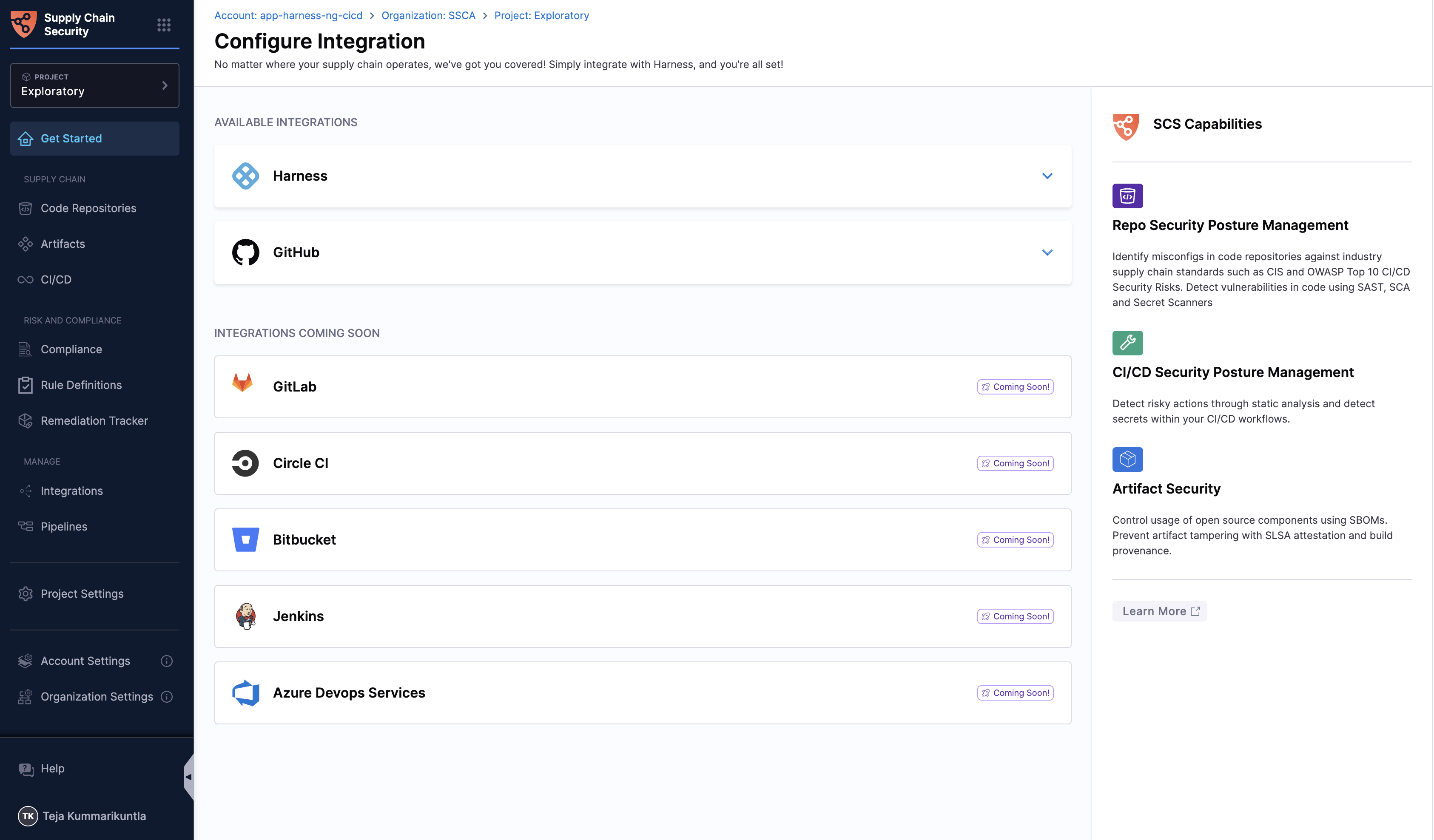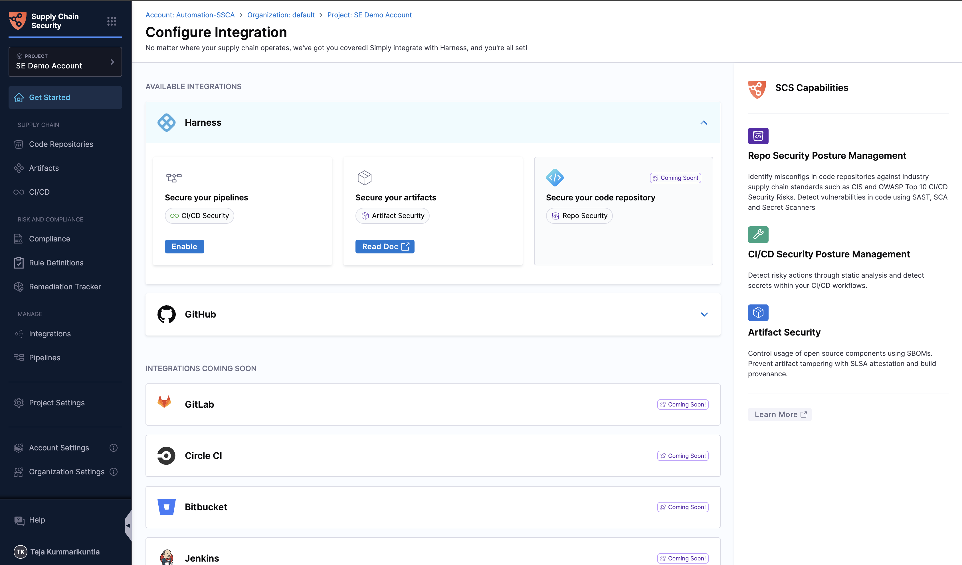 From the Get started page, click on Harness under available integrations, and select Enable on the CI/CD Security options. This will set up the CI/CD SPM on your Harness pipelines.