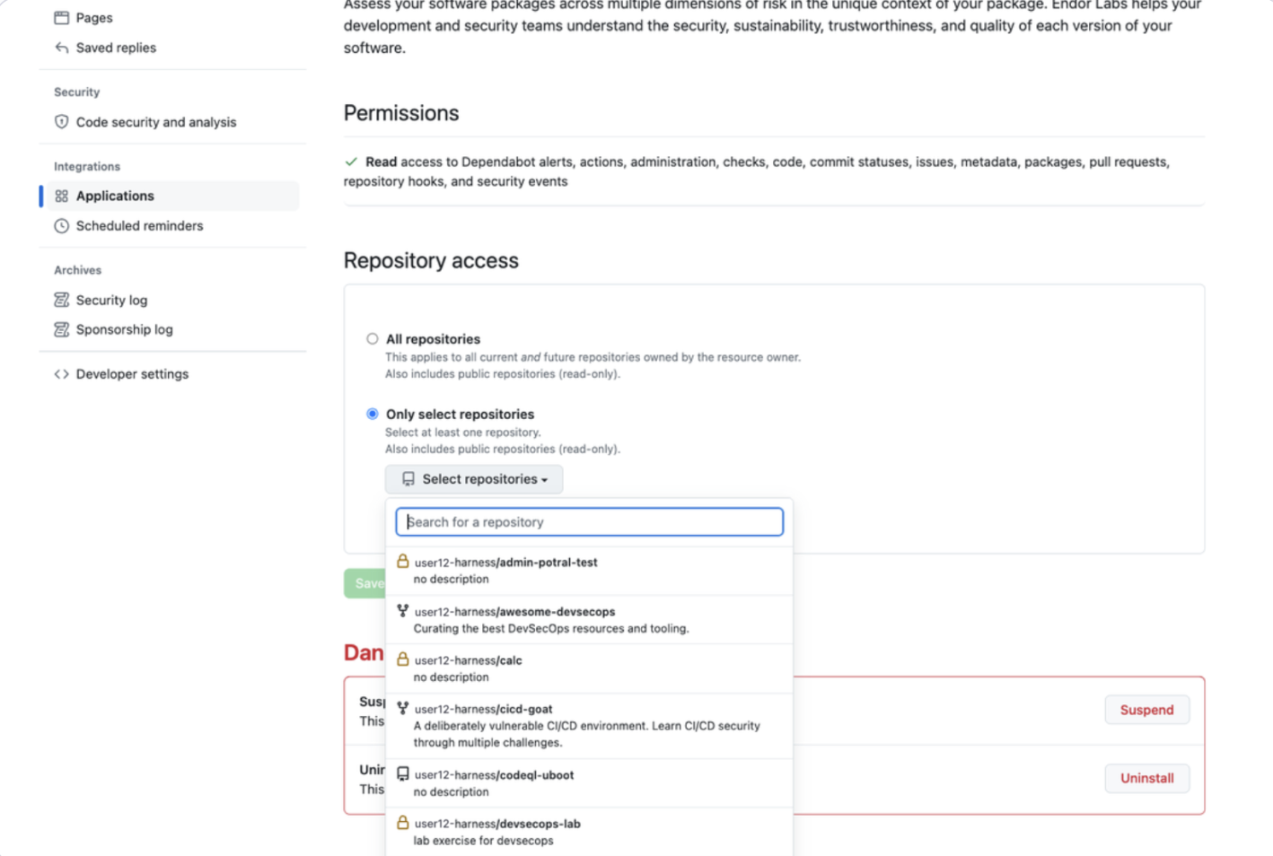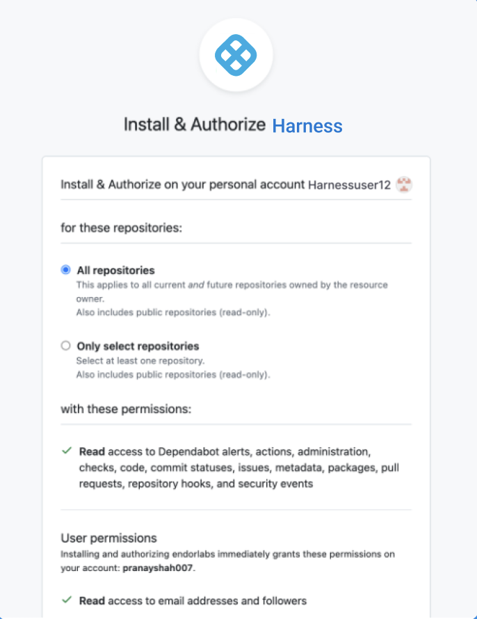 1. Grant access to repositories. You can either select all repositories or choose specific ones. By default, Harness performs scans on your repositories every 24 hours.